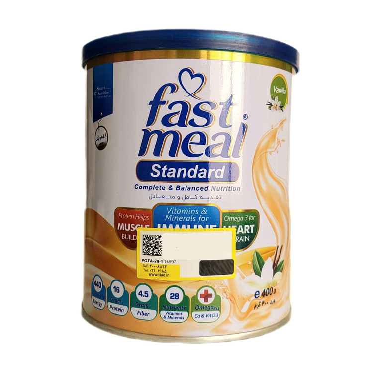 مکمل پودری فست میل استاندارد با دو طعم دلپذیر وانیلی و شکلاتی بصورت یک نوشیدنی، جایگزینی مناسب جهت تامین انرژی و مواد مغذی برای وعده غذایی به صورت خوراکی یا گاواژ و نیز بعنوان مکمل غذایی در بین وعده های غذایی و یا حتی نوشیدنی همراه غذا است. که حاوی مقدار بالای کلسیم، ویتامین D و نیز اسیدهای چرب غیر اشباع (لینولئیک و لینولنیک) می باشد.
