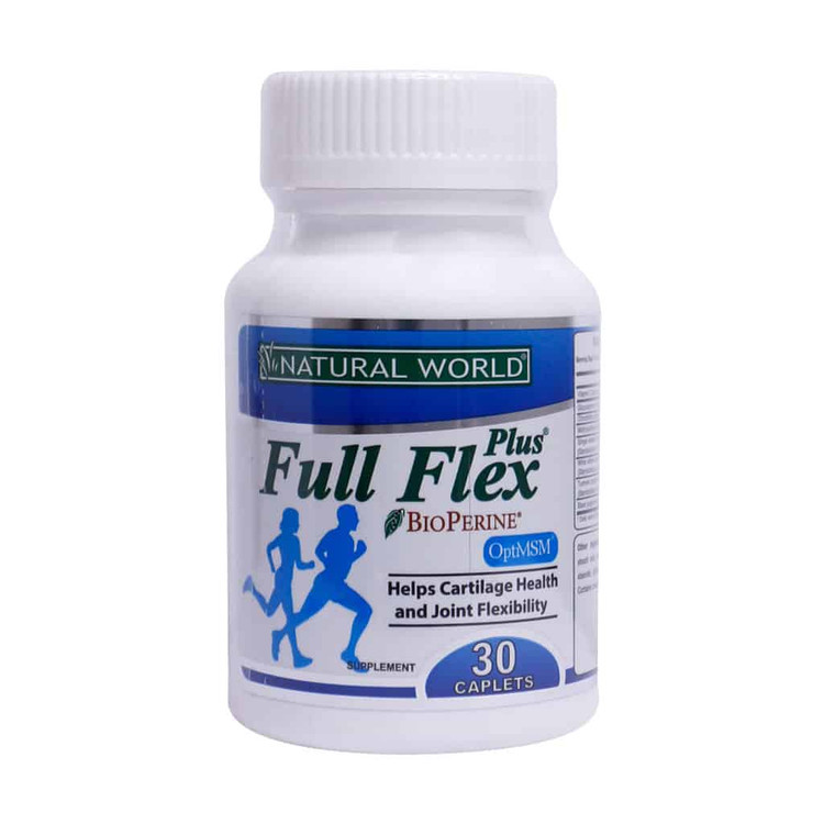 قرص فول فلکس پلاس نچرال ورلد ترکیبی ممتاز از چندین ماده گلوکزآمین، کندروئیتین و MSM (متیل سولفونیل متان) بوده که سبب بهبود و افزایش انعطاف پذیری مفاصل میشود. کندروئیتین جهت ساخت کلاژن که جهت استحکام بافت مفصلی الزامی است، نقش دارد. ترکیب فوق با ممانعت از فعالیت آنزیمهای لیزوزومی و کاهش مواد التهاب زا از بروز آسیبهای احتمالی به غضروف جلوگیری میکند. متیل سولفوئیل متان در بیماران مبتلا به آرتروز در التهاب مفاصل و کاهش درد موثر است.
